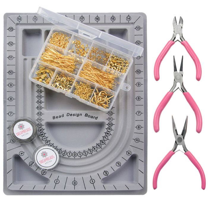 Un kit fabrication de bijoux en or pour la fabrication de bijoux. Avec un kit fabrication bijoux, vous pouvez facilement créer vous-même vos propres bijoux. Ce kit fabrication bijoux contient de nombreux pièces tels que des pinces, un plateau d'assemblage pour perles et de nombreux apprêt dans la couleur or. Un kit création bijoux est idéal si vous débutez dans la fabrication de bijoux. Les apprêts de ce kit de base sont en métal antiallergique avec un excellent rapport qualité-prix.